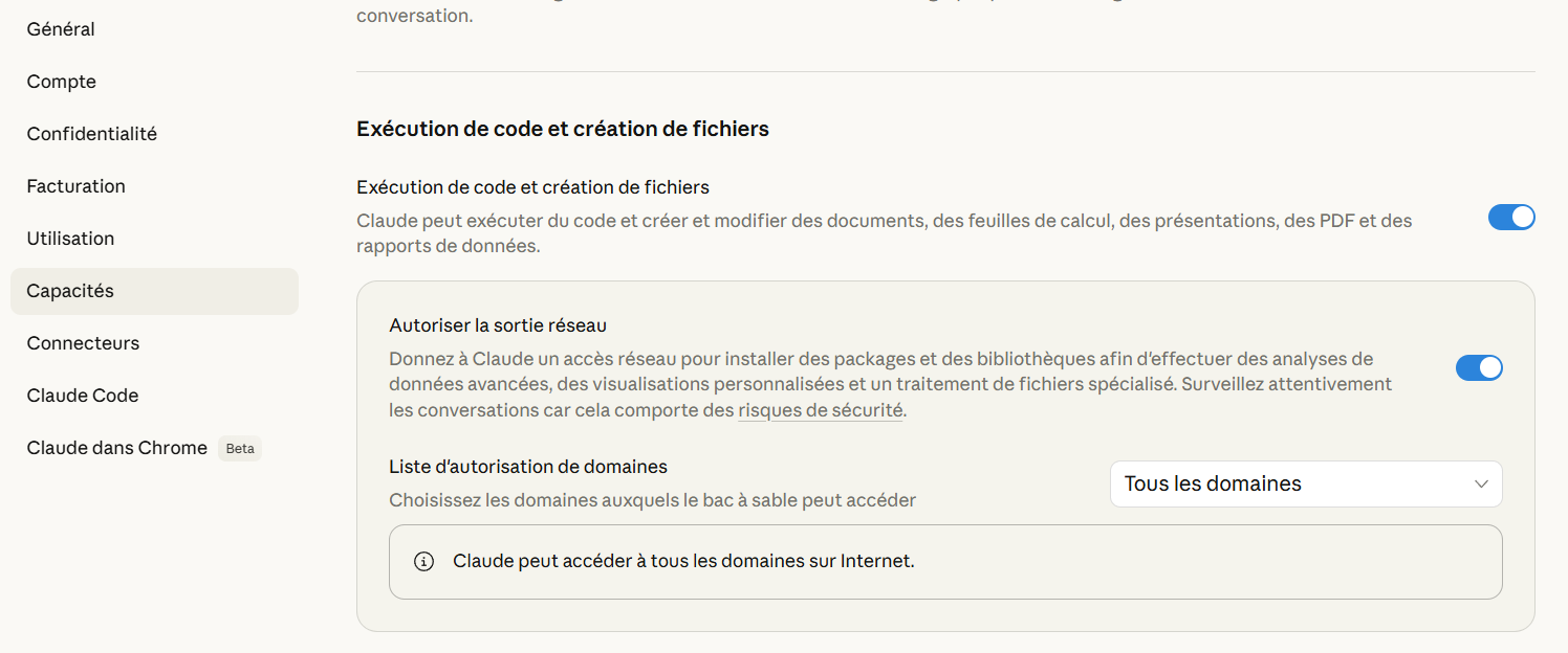 J’ai bien activé la sortie réseau dans les Capacités et ajouté ces domaines manuellement, mais ça ne change rien. Claude me dit que c’est une restriction de la plateforme Claude.ai elle-même.